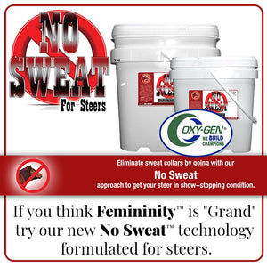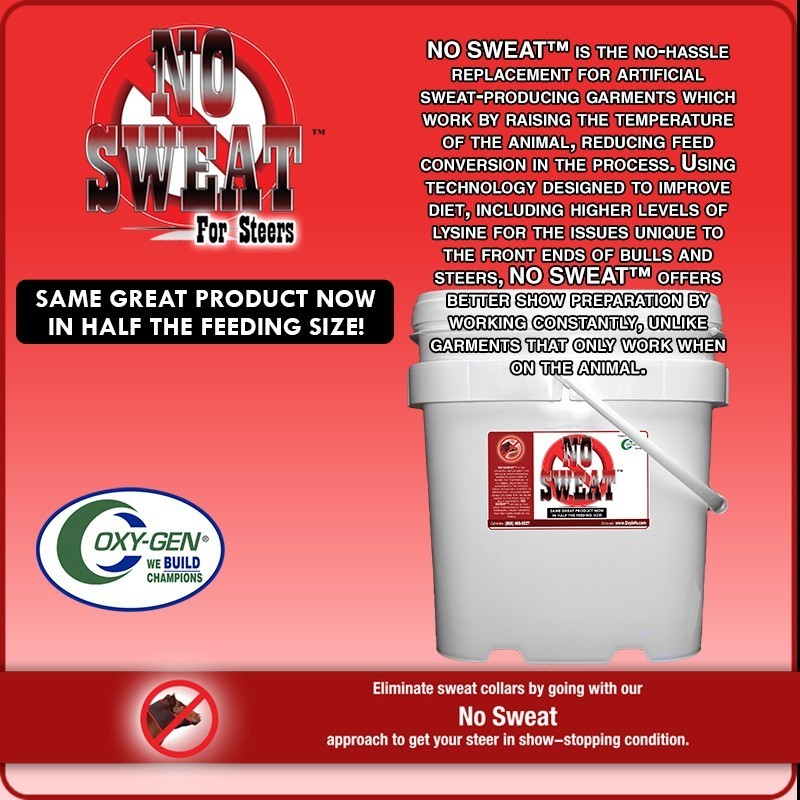 No Sweat Cattle Supplement. Helps Eliminate sweat collars by going with our No Sweat approach to get your steer in show-stopping condition.