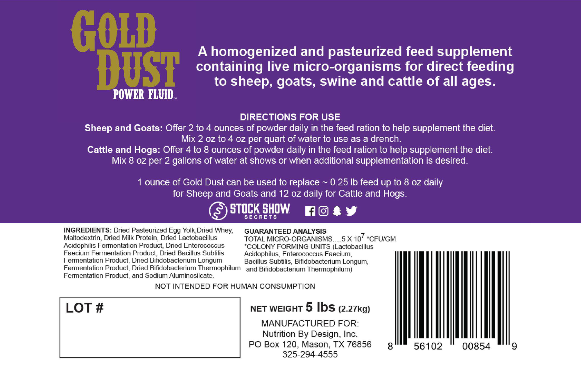 Time Tested & Banner Approved! Gold Dust is the premier product for show stock. It's been used to hang banners from coast to coast and border to border on ALL species; Cattle, Goats, Hogs & Sheep! Use it as a drench at Shows, or to supplement a reduction in feed to control bellies. This is a MUST have for every showman and show stock producer.