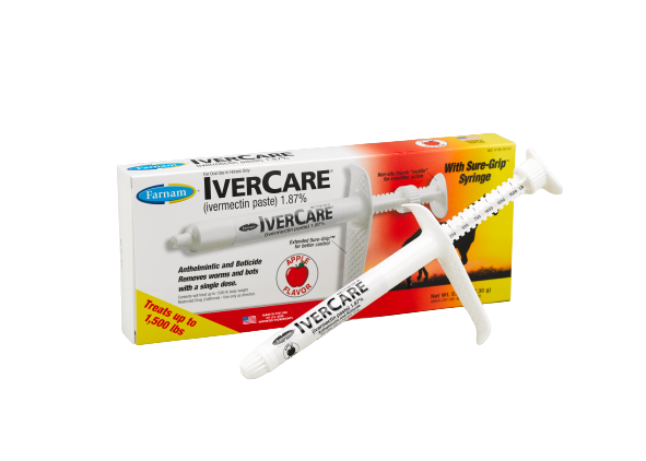 Remove worms and bots with a single dose of IverCare (ivermectin paste) 1.87%. This convenient paste offers broad-spectrum parasite control and comes in the extended Sure-Grip syringe. Proudly made in the U.S.A., it's the only ivermectin product that treats horses up to 1,500 pounds in a single dose.